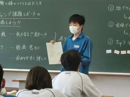 生物のからだのつくりとはたらきの単元のジャンプ課題である「学習したことをまとめ、追究課題をさらに見つけて、もっと調べてみよう」に迫るために作り上げたレポートの発表が行われていました。