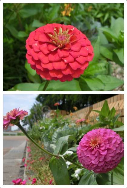 正門の花壇には、様々な種類や色のヒャクニチソウが咲き始めています。
