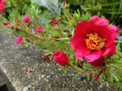2棟と3棟の間の花壇で咲くマツバボタン(松葉牡丹)。暑さに強い植物です。葉が松の葉に似ていて、花がボタン(牡丹)に似ていることからこの和名がついたそうです。花言葉は「無邪気」「可憐」。高中生にピッタリの花言葉ですね。