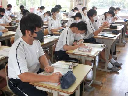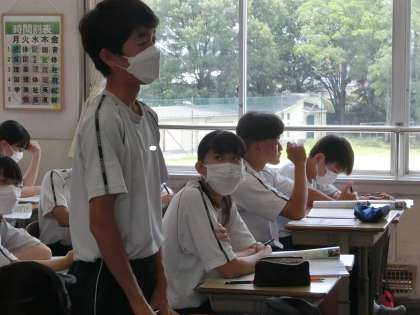 7/8 世の中の動きを知る 3 公開日 2023/07/09 更新日 2023/07/09 各学年から 昨日の3年2組の社会・公民分野の授業の様子です。 「国際平和のための自衛隊の国際貢献、基本的人権の尊重」について学習が進められていました。 教科書や映像からわかることをワークシートに書き込んだり、発表して共有したりしていました。
