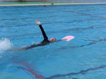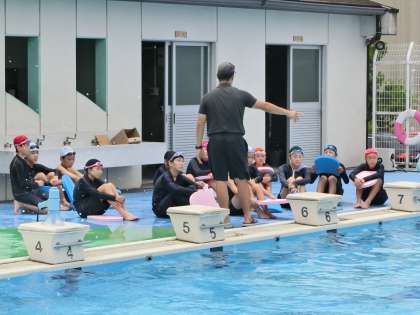 クロールのきれいな泳法をマスターするため、仲間と協力して練習に取り組んでいました。