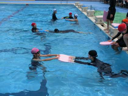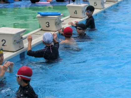 クロールのきれいな泳法をマスターするため、仲間と協力して練習に取り組んでいました。