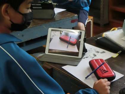 自身の筆箱と筆記用具を題材にしたスケッチでの作品づくりが行われていました。