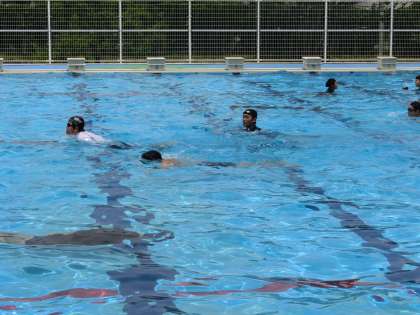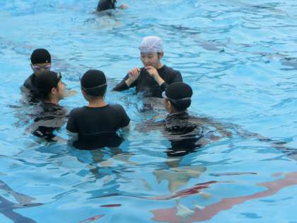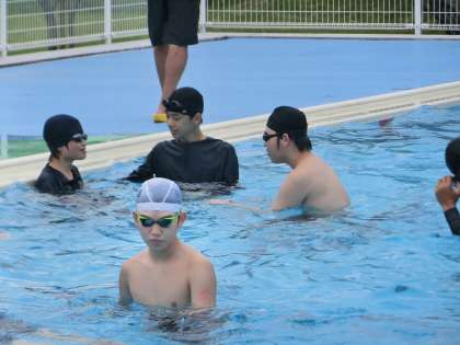 クロールや平泳ぎなど、最低限身につけておきたい泳法をしっかりとマスターするため、仲間との練習に取り組んでいました。