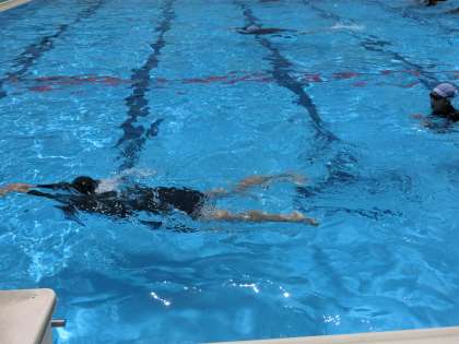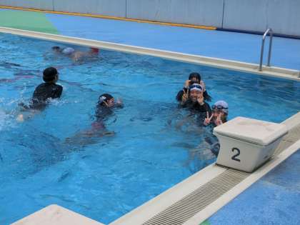 クロールや平泳ぎなど、最低限身につけておきたい泳法をしっかりとマスターするため、仲間との練習に取り組んでいました。