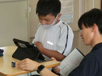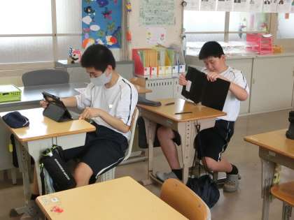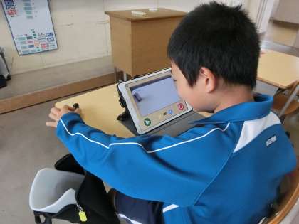 悪天候により計画していた学級菜園の野菜の観察ができなかったため、学習用タブレットのアプリを使ってコマ撮り動画を製作していました。