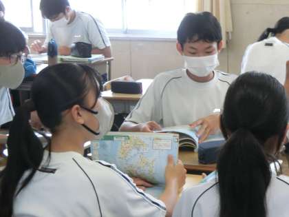 7/18 知恵と知識と地図帳 4 公開日 2023/07/18 更新日 2023/07/18 各学年から 2年2組の社会・地理分野の授業の様子です。 都道府県名や県庁所在地を確認したあと、いくつかのキーワードから特定の件を絞り込んでいく活動に移っていました。 グループ対抗のため、仲間の知恵や知識が重要になってきます。頼りになのは地図帳だけ。教科担任から正解をもらってガッツポーズで帰って行く生徒の表情が印象的でした。 9月からの学習で、楽しみがまた増えていたようです。