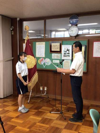 集会の初めに、豊田・みよし地区中学校総合体育大会などの表彰伝達が行われました。