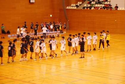 勝てば県大会出場、負ければ引退が決まる大事な一戦(3位決定戦)です。選手たちの活躍を応援するベンチにも熱が入ります。観客席で応援する家族の方たちや女子ハンド部のメンバーも懸命に声援を送ってくれました。