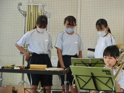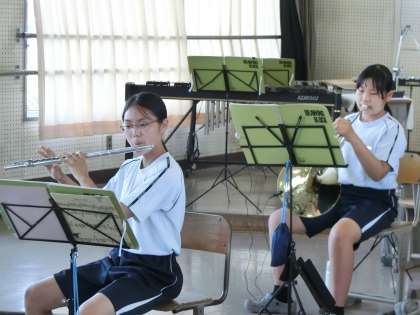 明日に控えたコンクールに向け、2,3年生は最後の調整です。また1年生は、早く楽器が演奏できるよう、顧問からマンツーマンで指導してもらっていました。