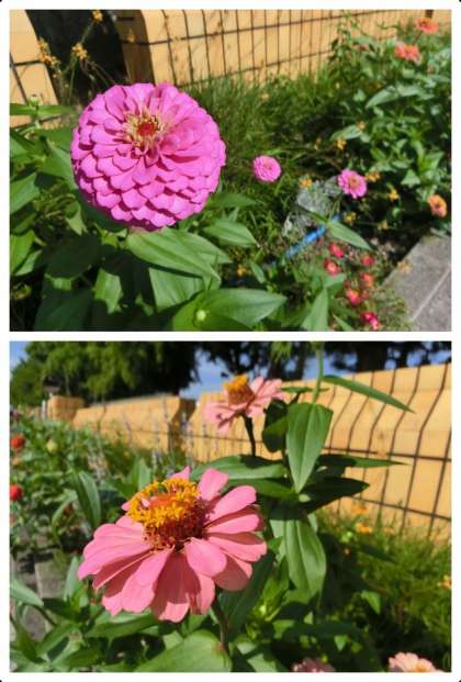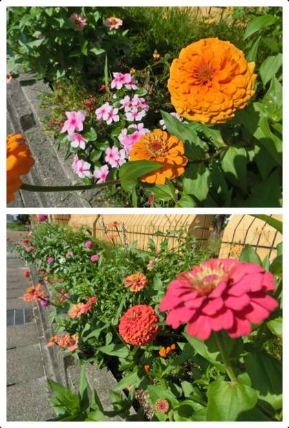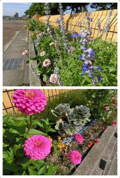 正門横の花壇に咲く形状も色も様々なジニア。夏の暑い日差しにも負けない様子は、私たちに元気を与えてくれているようです。草取りなどの花壇の世話を暑さの中でも頑張ってくださっている公務手さんの思いも伝わっているように感じます。