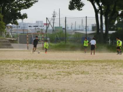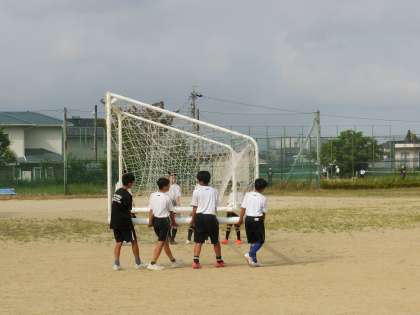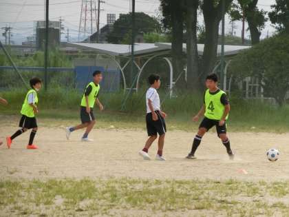 基礎メニューにしっかりと取り組んだあと、ミニゲームで試合の感覚をつかんでいきます。この繰り返しで自分の強みや弱点を確認し、次回の練習でも目的をもって活動に取り組んでいきます。暑い中の限られた時間での練習ですが、しっかりと体力と技術を身につけてほしいと思います。