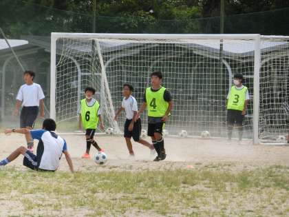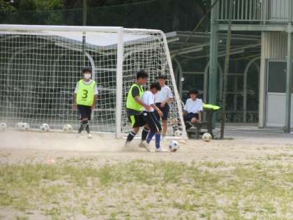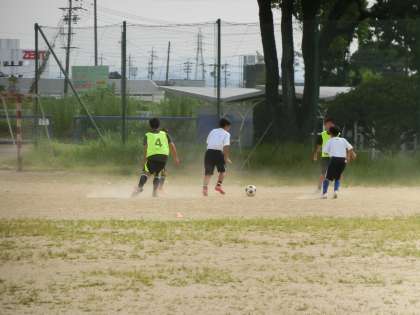 基礎メニューにしっかりと取り組んだあと、ミニゲームで試合の感覚をつかんでいきます。この繰り返しで自分の強みや弱点を確認し、次回の練習でも目的をもって活動に取り組んでいきます。暑い中の限られた時間での練習ですが、しっかりと体力と技術を身につけてほしいと思います。
