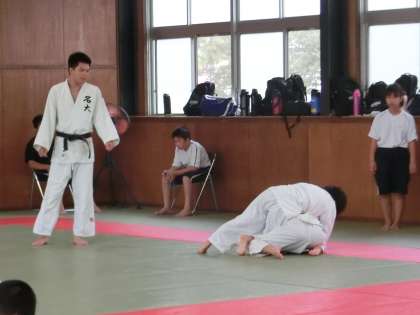 2年生を中心に技の練習が行われていました。1年生は周りから先輩の練習の様子をしっかりと見ています。先輩たちがぶつかりそうな場面になると、すぐに間に入り、安全に練習できるように緊張感をもちながら学んでいます。