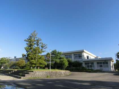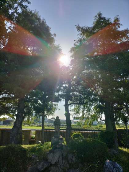 正門横の二宮金次郎像の頭上に朝日が神々しく光っています。夏休み中の学習や研究がはかどりますように…。