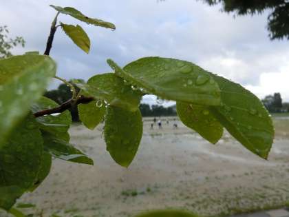 次第に雲の色も薄くなり、小雨に変わりました。そんな状況でも、サッカー部は練習を始めていました…。