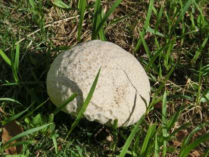 先日行われた「親子草取り」の前に、有志の方々で行ってくださった「早朝草刈り」の時は気付かなかったナゾの植物(キノコのようなもの)を発見しました。大人の拳ほどの大きさがあります。最初は石と思ったほどです。たった数日で巨大化したものと思われます。