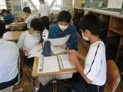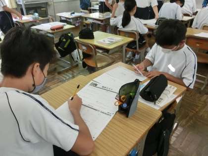 定期テスト目前ということもあり、夏休み課題の復習プリントに仲間とともに取り組んでいました。