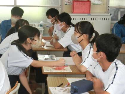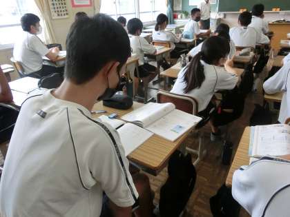夏休み前に学習した内容の復習が行われていました。定期テストを控え、仲間同士での確認も積極的に行われていました。