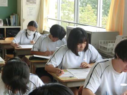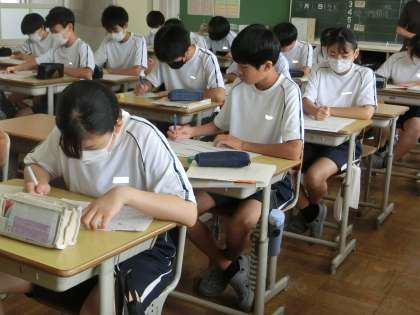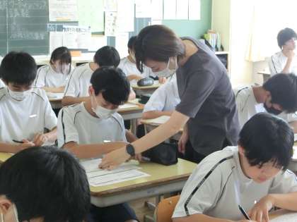 夏休み課題の確認プリントに取り組んでいました。真剣さあり、教科担任に気軽に質問する様子ありと、定期テストに向けてのよい学習の雰囲気ができているようです。