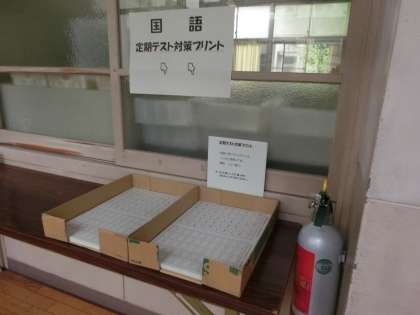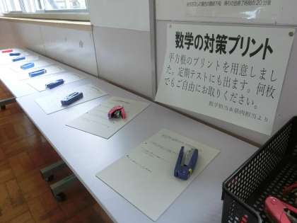 テストに向けての意識づくりのため、昇降口や廊下、階段の踊り場など、生徒が毎日通り、必ず目にする場所に対策プリントが用意されています。持ち帰りは自由で、なくなれば補充されます。