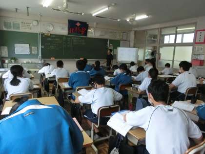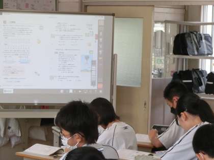 一次関数について学んでいました。提示された問題を仲間と一緒に考えていきます。丁寧に教えてもらえるペアもあれば、一緒に悩んでいるペアもありました。