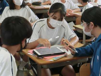 職場体験学習に向けて、依頼電話のかけ方について学んでいました。「目の前に相手がいると思って話そう」をテーマに、個人で練習した電話のかけ方を仲間同士で確認していました。
