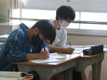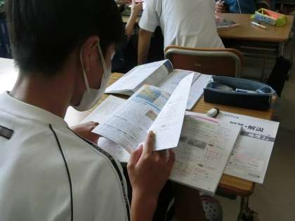 定期テストに向けての勉強に励んでいました。確認したい内容がたくさんあるのが社会科。改めて教科書を読み直す、テキストで力を試す、プリントで学習内容を確認するなど、直前に必要な各自の勉強方法で頑張っています。