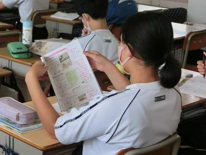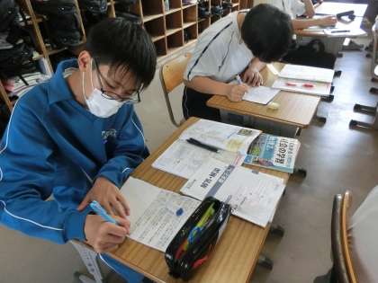 定期テストに向けての勉強に励んでいました。確認したい内容がたくさんあるのが社会科。改めて教科書を読み直す、テキストで力を試す、プリントで学習内容を確認するなど、直前に必要な各自の勉強方法で頑張っています。