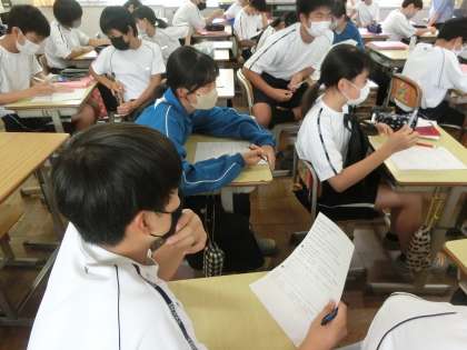 9/6 勉強は自分と仲間のため 3 公開日 2023/09/06 更新日 2023/09/06 各学年から 昨日の1年3組の英語の授業の様子です。 定期テストの勉強に取り組んでいました。自身の点数アップのための勉強はもちろんですが、仲間の点数アップのためにも協力していました。また、笑顔が多く見られる雰囲気も印象亭でした。