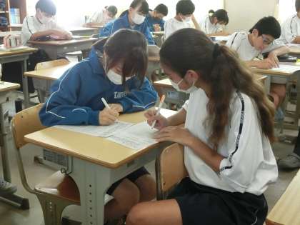 定期テストに向けての勉強に励んでました。仲間と問題を出し合ったりして、お互いが勉強していない部分を補っていきます。学校だからできる大切な勉強法の一つです。