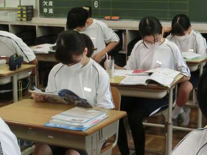*写真は、1年3組の朝の勉強の様子です。