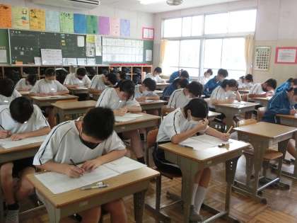 定期テスト初日の問題に取り組む2年2組の様子です。