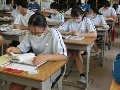 *写真は、2年5組の朝の勉強の様子です。