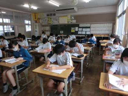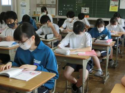 *写真は、2年3組の朝の勉強の様子です。
