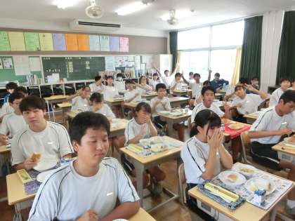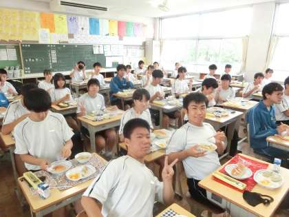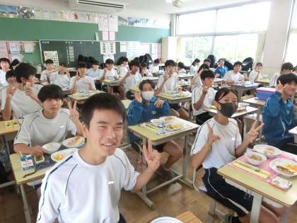 3日間の定期テストのすべてを終え、いよいよ給食の時間です。「明日はもうテストもないし、学校も休みだし…」ということで、3年生の教室を覗いてみました…。