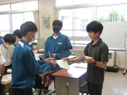 定期テストの返却が行われていました。感心したのはテストの受け取り方。教科担任に正対する、両手でもらう、お辞儀をするなど、返却されるテストを受け取る行為一つをとっても、テストに対しての意識の高さが違ってきます。