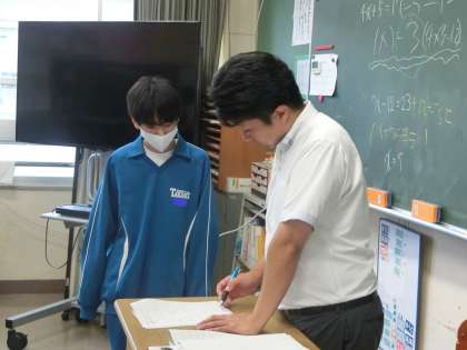 各自の課題に取り組んでいました。積極的に仲間や先生に尋ね、「できない」を減らしていきます。自信をつけた生徒が、黒板を使って解き方を説明してくれました。