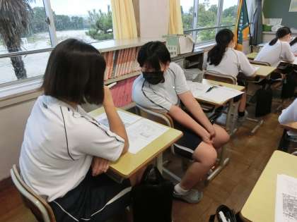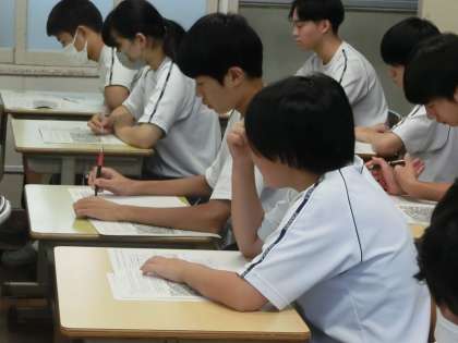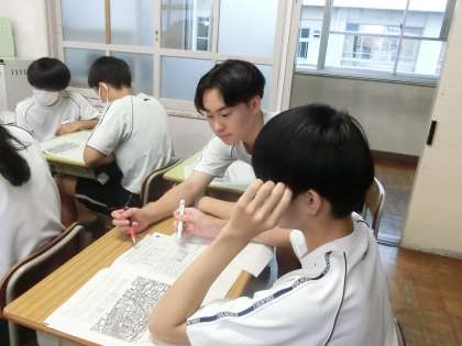 テスト返却前に解説が行われ、ようやくテストが手元に戻ってきます。自分がどんな解答を記したかを思い出したりすることは、知識の定着にもつながっています。また、仲間の考え方を共有することで、今後の学習のヒントにもなっています。