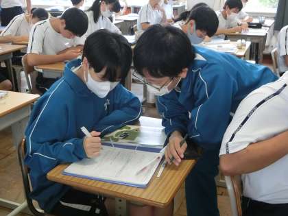 二次方程式の解(公式)について学んでいました。公式に数字を当てはめていけばいけると思ったのも束の間、途中の計算が思ったより難しかったようです。そのためやっと導き出した答えを仲間のところに確認に行き、お互いの考え方も共有しています。