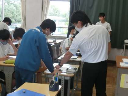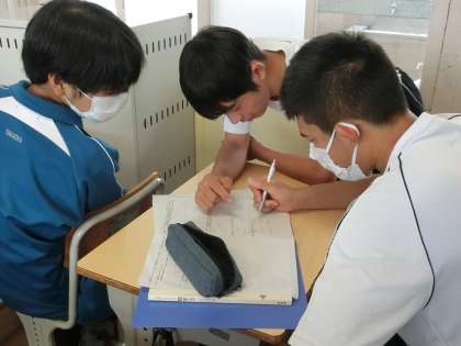 二次方程式の解(公式)について学んでいました。公式に数字を当てはめていけばいけると思ったのも束の間、途中の計算が思ったより難しかったようです。そのためやっと導き出した答えを仲間のところに確認に行き、お互いの考え方も共有しています。