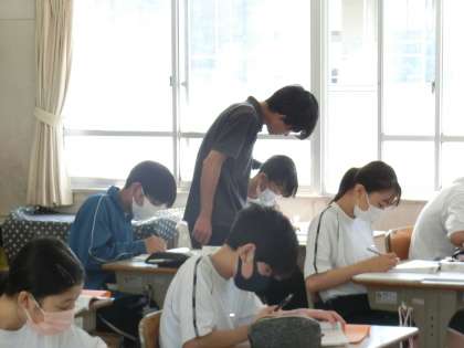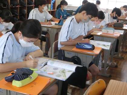 植物の体のつくりとはたらきの単元で、「葉のつくりをまとめよう」をテーマに学習が進められていました。授業内で学習した内容を自分なりの言葉やレイアウトでプリントにまとめていきます。今後に役立つ学習の進め方やノートのまとめ方など、教科担任の工夫が光ります。