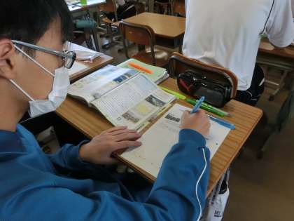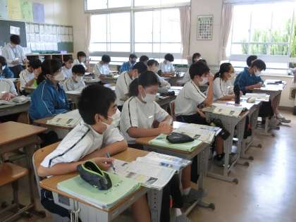 「九州地方について知ろう」をテーマに学習が進められていました。教科書や資料・映像などから、この地方の特色を見つけ出していきます。様々な事柄を受け身ではなく、自分で解き明かしていこうという雰囲気が伝わってきた授業でした。