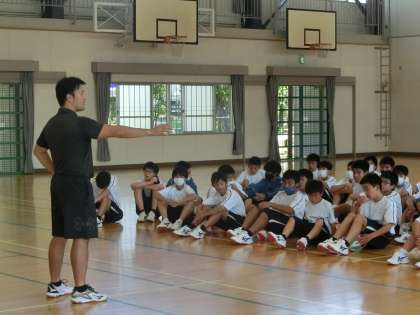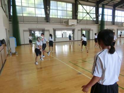 バレーボールのパス練習に取り組んでいました。ペアになり、アンダーハンドやオーバーハンドのパスを技術を習得しようと努力しています。現在はまだまだ10回を超えるペアはごくわずかですが、失敗を気にせず、仲間と明るく活動している姿が印象的でした。しっかり練習してゲームを楽しんでほしいと思います。
