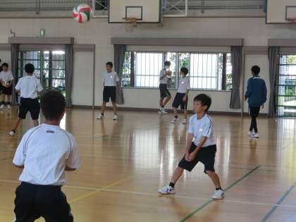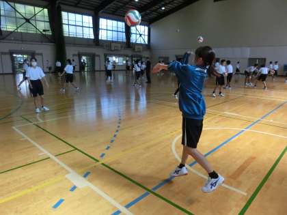バレーボールのパス練習に取り組んでいました。ペアになり、アンダーハンドやオーバーハンドのパスを技術を習得しようと努力しています。現在はまだまだ10回を超えるペアはごくわずかですが、失敗を気にせず、仲間と明るく活動している姿が印象的でした。しっかり練習してゲームを楽しんでほしいと思います。