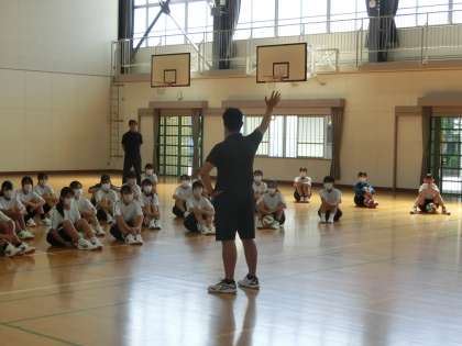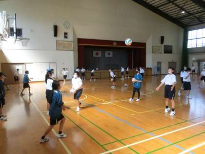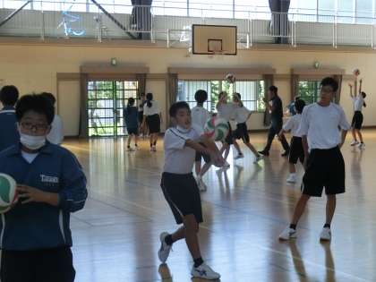 バレーボールのパス練習に取り組んでいました。ペアになり、アンダーハンドやオーバーハンドのパスを技術を習得しようと努力しています。現在はまだまだ10回を超えるペアはごくわずかですが、失敗を気にせず、仲間と明るく活動している姿が印象的でした。しっかり練習してゲームを楽しんでほしいと思います。