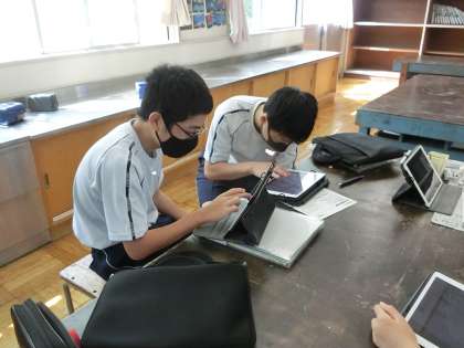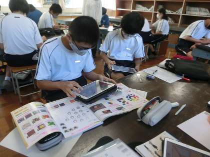 理想の空間のスケッチもようやく下書きが完成し、そのデータをタブレットに落とし込んで作業を続けていました。今回のテーマは、配色の決定。画面上で色を付けたりけしたりが簡単にできるため、イメージする作品(配色)になった時点で、実際に絵の具や色えんぴつを使っての着色に移っていきます。