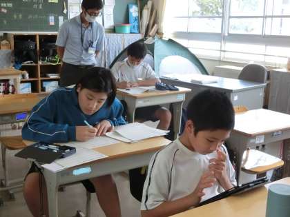 「高岡英語検定」というものに取り組んでいました。単語の難易度によって球が設定されています。何枚にも挑戦し進級をめざしている生徒、タブレットでじっくりと学習に打ち込む生徒など様々です。