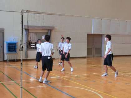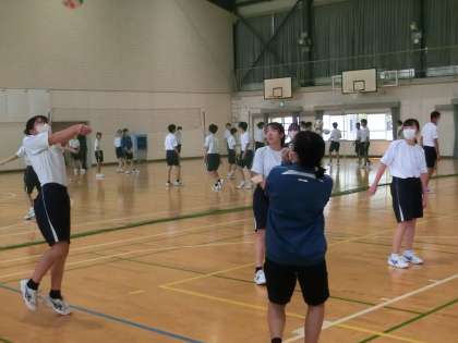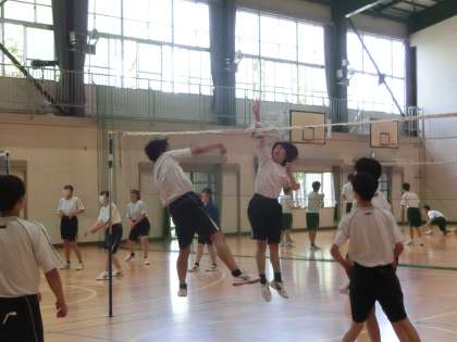 バレーボールのゲームが行われていました。チームは男女別ですが、対戦は性別を問わずに行います。まだまだ始まったばかりの単元ですが、体育館中が元気な声と熱気に包まれていました。