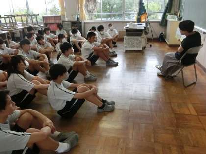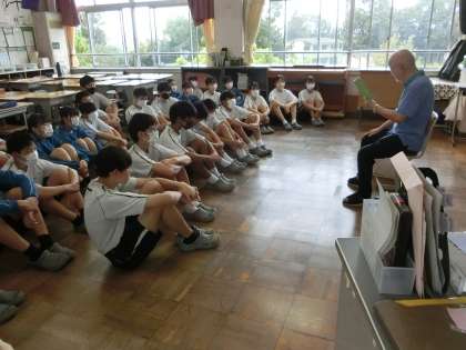 本日の朝の活動で行われた「ハピクロ(=ハッピークローバーによる読み聞かせ)」の様子です。